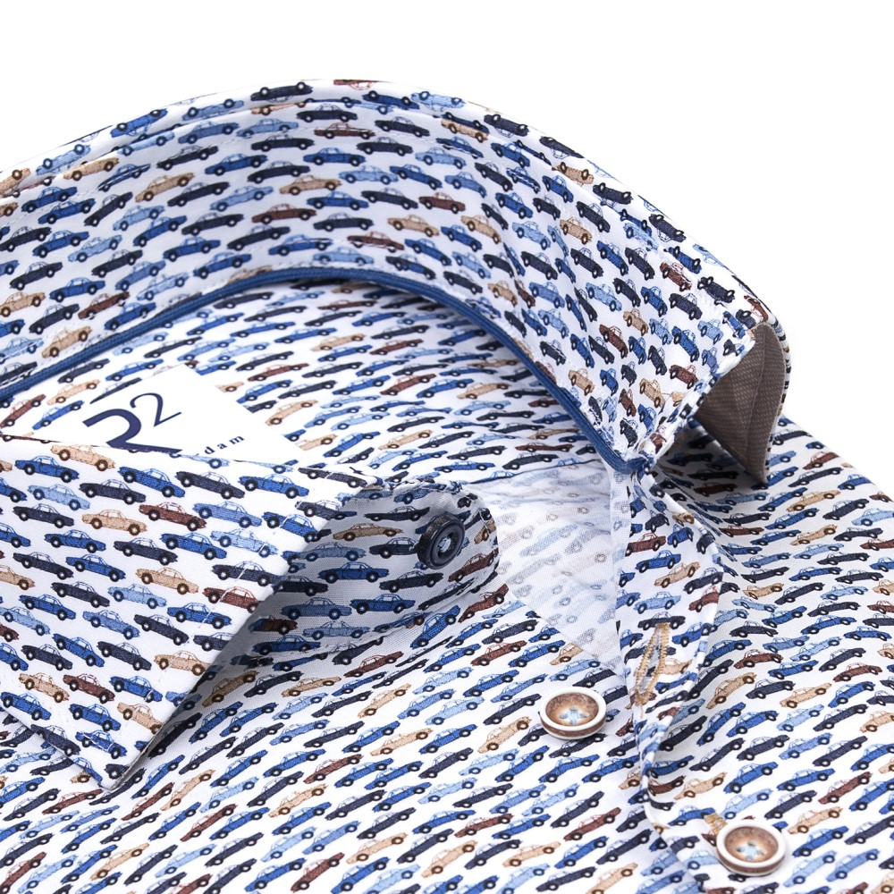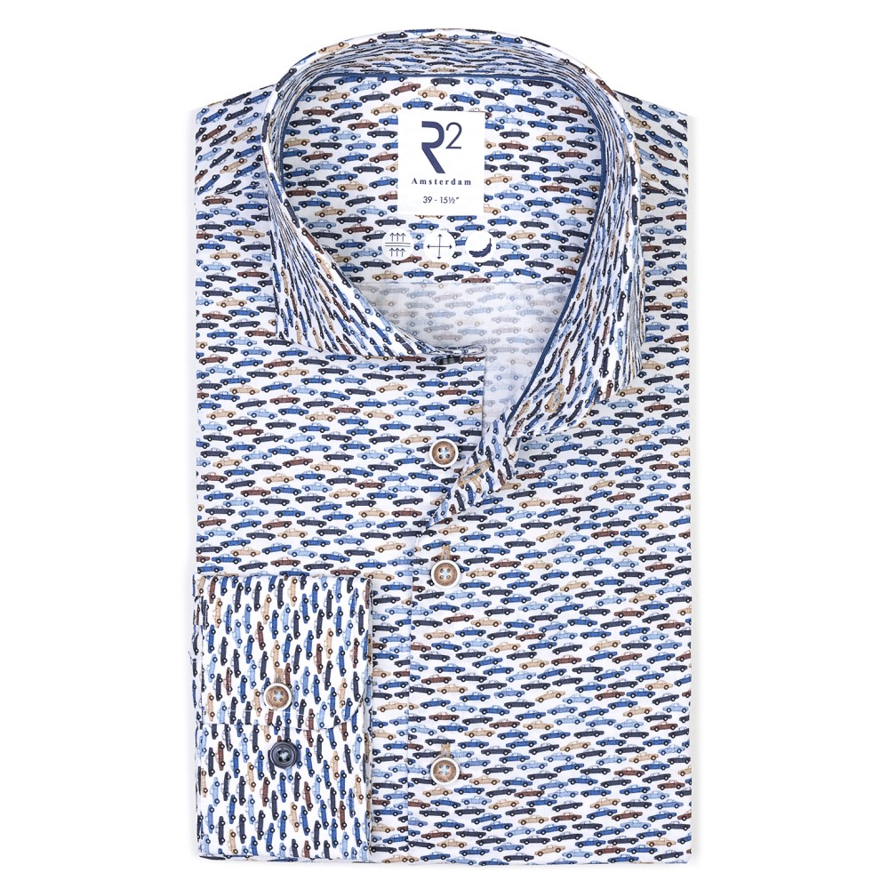 Dit overhemd met witte ondergrond en subtiele Spider-autootjes geeft je outfit een unieke uitstraling.
